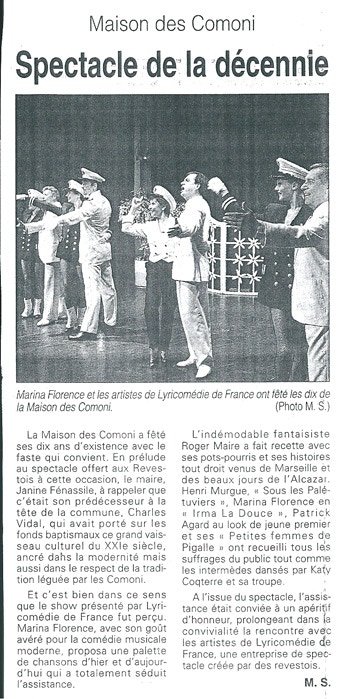 « Elle ne constitua pas, pour nous qui la connaissons, une révélation, mais tout de même, Marina Florence, l’épouse du grand trial Henri Murgue, nous dévoila un autre aspect de son incontestable talent de fantaisiste dans son personnage de « Mi » qu’elle sût interpréter avec un brio qui faisait plaisir à voir. Son chant, ses évolutions chorégraphiques, l’émotion qu’elle sût communiquer à la salle quand vint le moment des dramatiques adieux, lui valu de longs et bien encourageants applaudissements. »